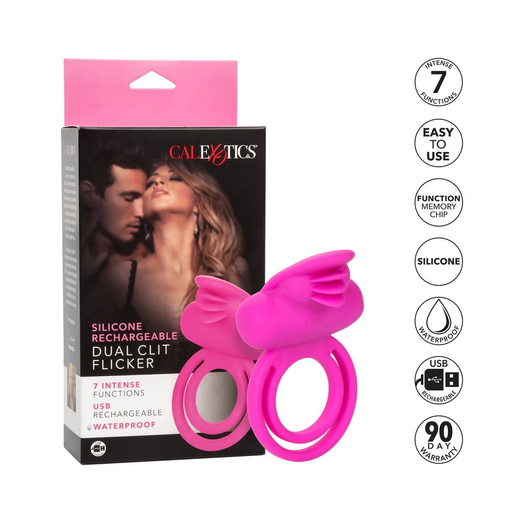 The Silicone Rechargeable Dual Clit Flicker mixes 7 intense functions of vibration with an erotically fluttering package for double the knee-shaking pleasure. This dual stimulator ring sizes are great for beginners looking to spice things up or erotic experts looking to add intense pleasure to their arsenal.