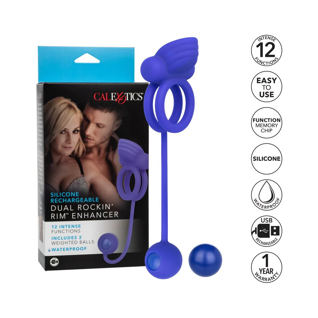 The Silicone Rechargeable Dual Rockin' Rim Enhancer will send you and your lover swinging into ecstasy. The powerful rocker has a contoured ridged teaser, dual enhancer ring and 2 interchangeable weights. This dual enhancer ring is paired with 2 interchangeable weights meant to thrill with every swing and tug. Use the smaller 30 g weight for a gentle tug and the heavier 50 g weight for sensational swinging stimulation.